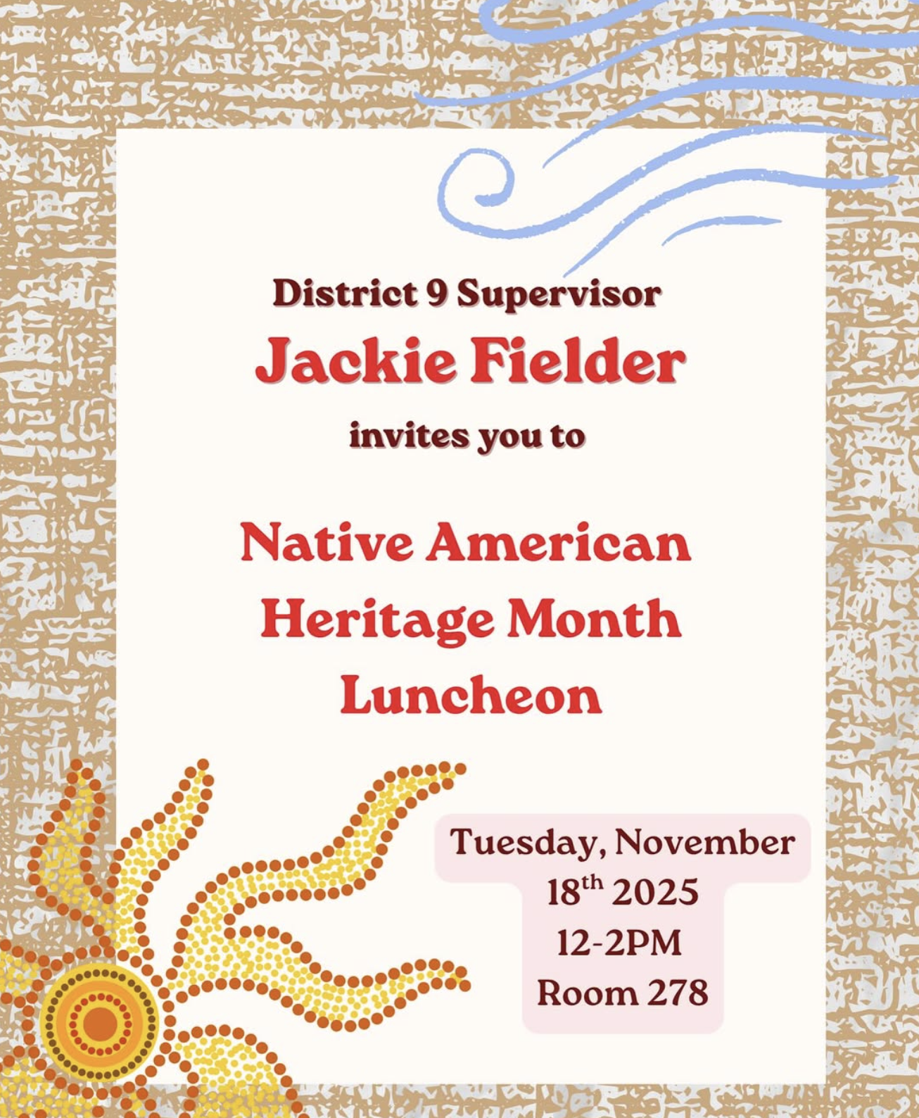 District 9 Supervisor Jackie Fielder invites you to join us for a special luncheon celebrating the voices, traditions, and strength of Native communities.